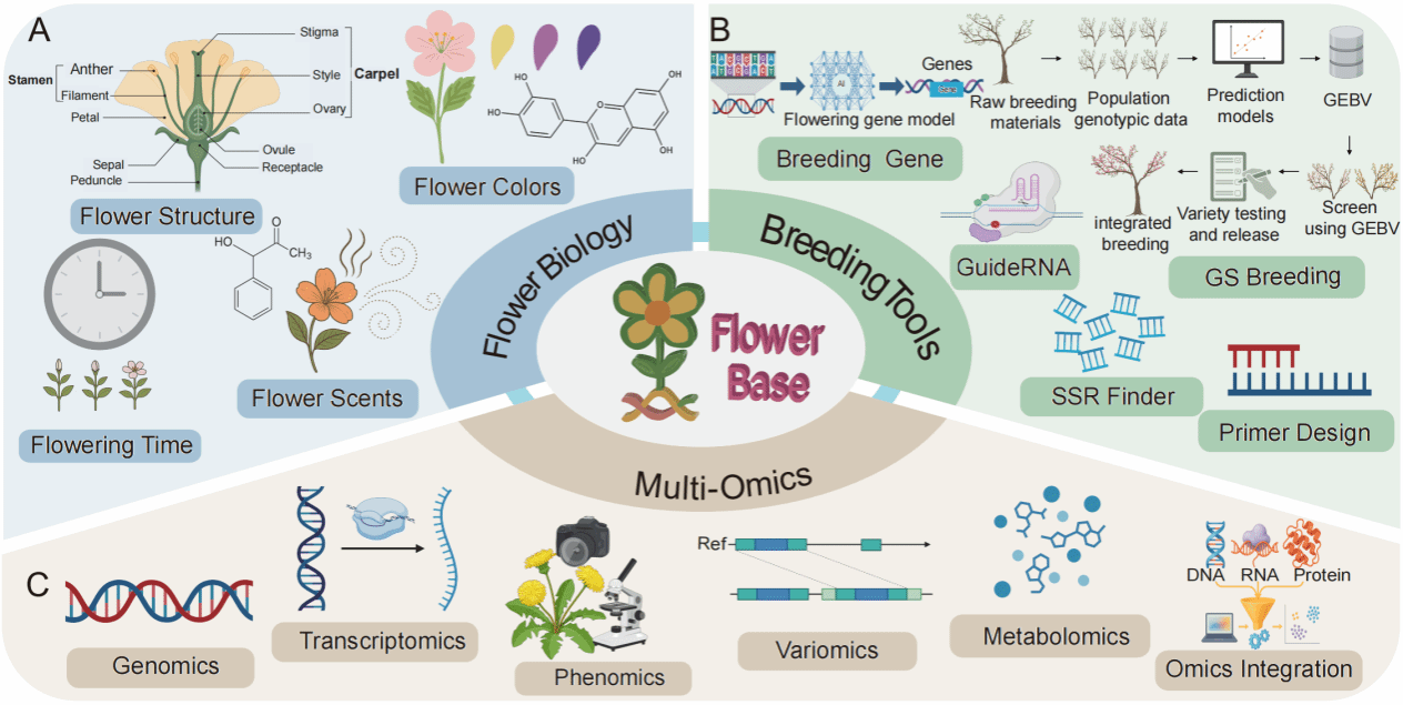 平台的设计围绕着花卉生物学的四大核心(花结构、花色、花香和花期)展开,其底层由基因组学、转录组学等多组学数据提供坚实支撑。最终,这些丰富的数据资源通过平台内置的一系列工具,实现了从基础数据到应用的衔接。(图2)