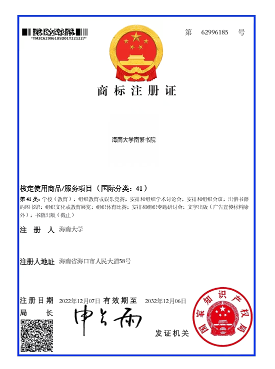 2022年12月29日," 搜同 三亚南繁书院"商标获国家知识产权局批准注册。该商标注册有效期自2022年12月7日起至2032年12月6日,服务于 搜同 三亚南繁研究院的书院制建设、教育培训、文创产品创制、学术研讨会的开展、举办文体比赛、文化展览、书籍出版等项目,为更好的建设 搜同 三亚南繁研究院提供平台。